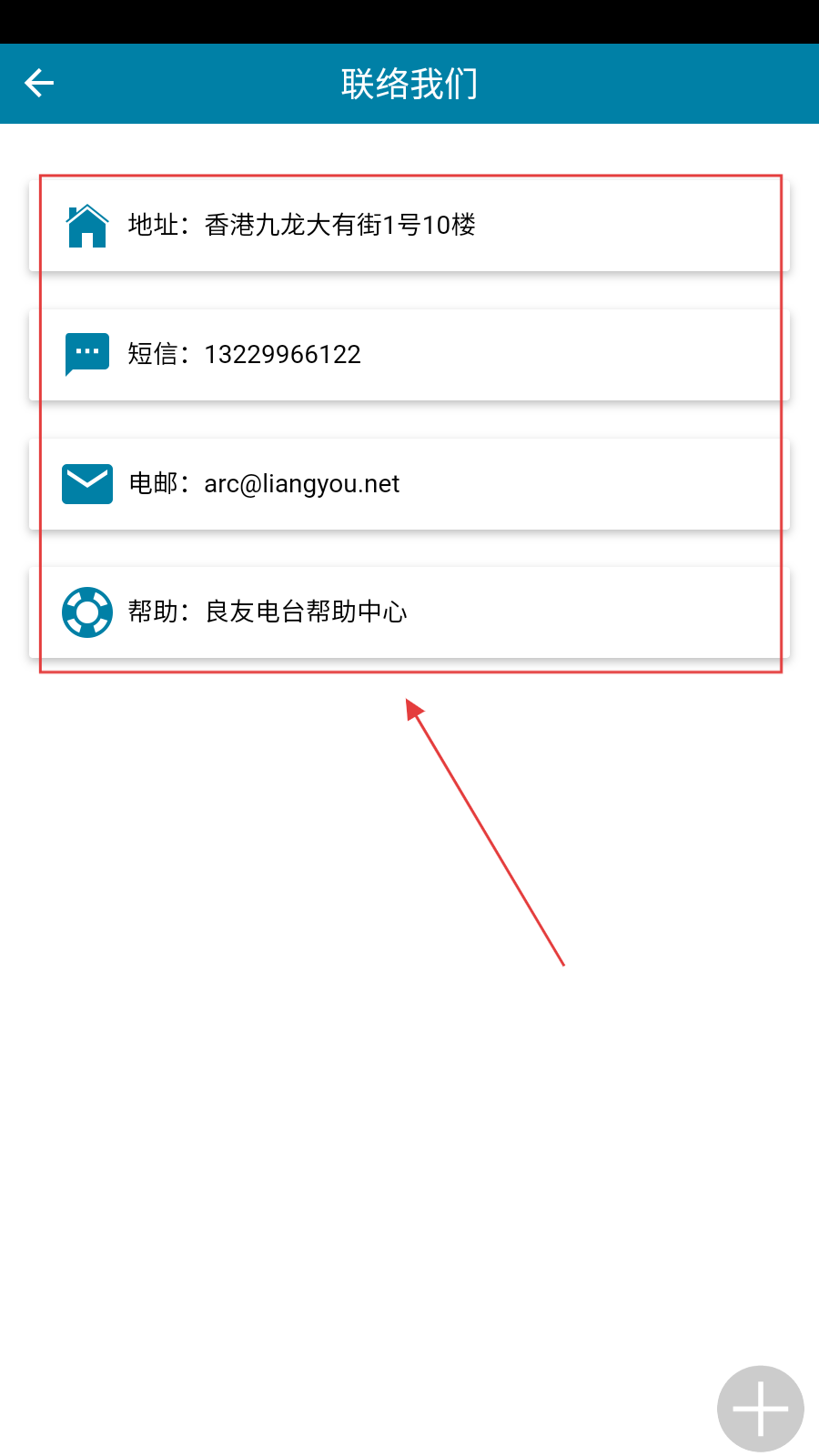 2、在联络我们界面,能通过【地址、短信、电邮联系电台】,也可进入【良友电台帮助中心】获取帮助。
