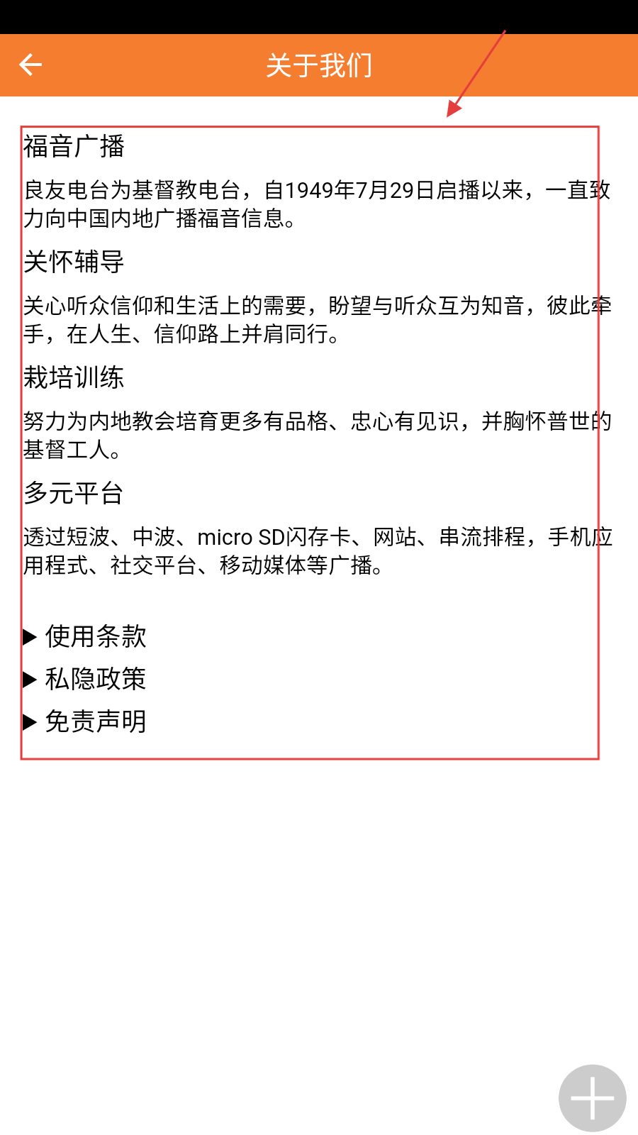 3、查看关于我们,可【了解电台的福音广播、关怀辅导等内容】,还能查看【使用条款、私隐政策】等。