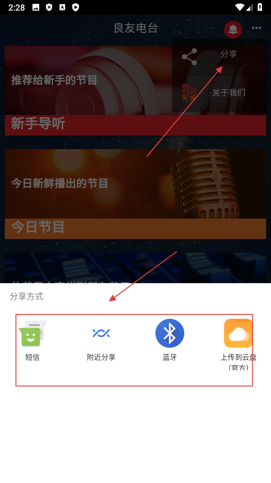 4、点击【分享】,可通过【短信、蓝牙】等方式,把良友电台的内容分享给他人,让更多人了解电台。