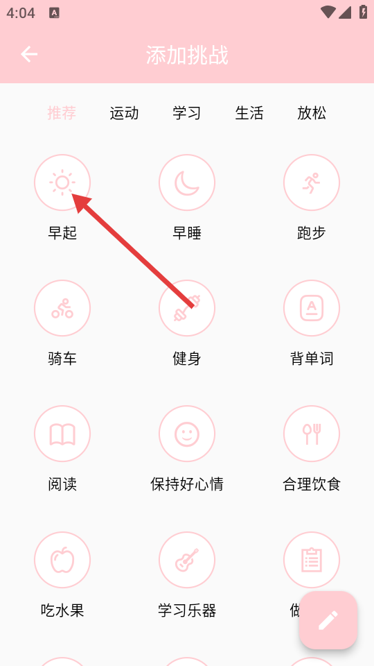 3、进入添加挑战页面,选择挑战类型(如“早起”)。