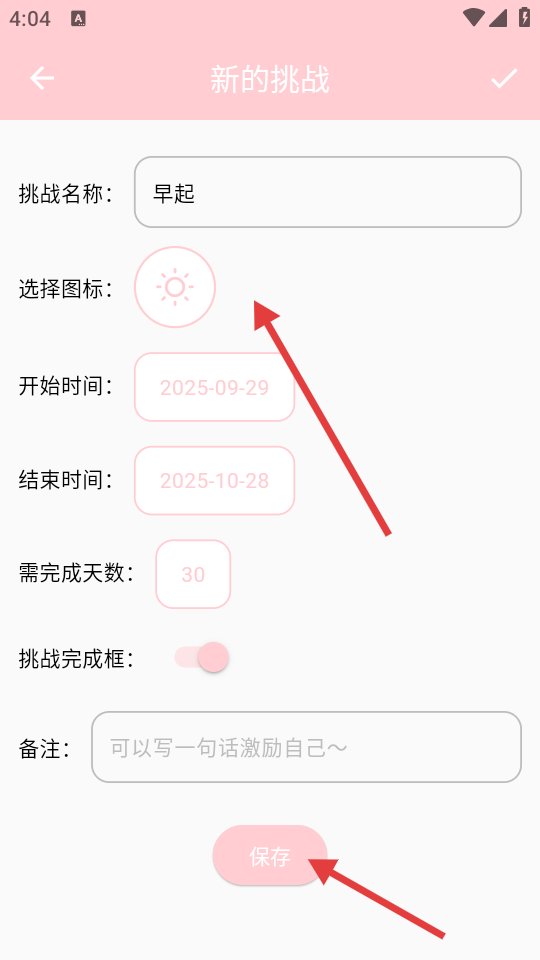 4、进入新的挑战设置页面,填写挑战名称、图标等信息后,点击【保存】完成挑战添加。