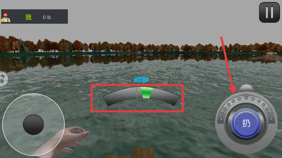 3、抛竿时观察力度条(绿色区域为佳),点击【扔】按钮,把握力度和时机,精准抛竿至目标水域。