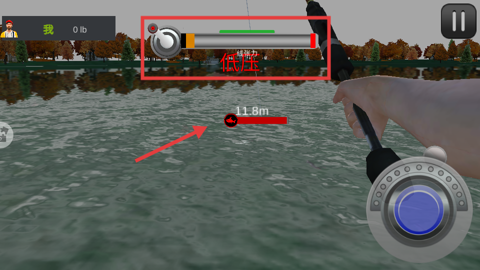 4、遛鱼时关注【线张力】条(低压状态下操作),根据鱼的距离(如【11.8m】)调整,避免断线成功钓获。