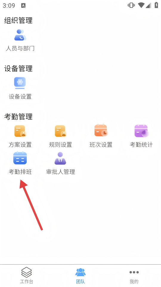 2、在团队界面,找到并点击【考勤排班】,进入人员排班页面。