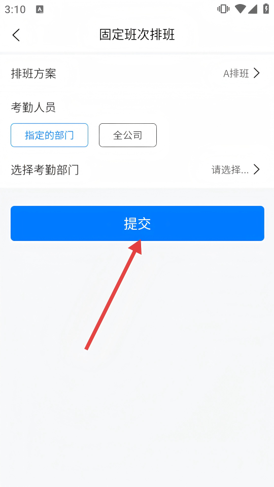 4、在固定班次排班页,设置排班方案、考勤人员等信息后,点击【提交】,完成考勤排班操作。
