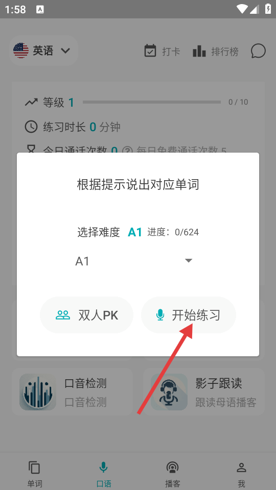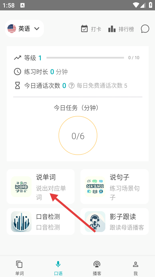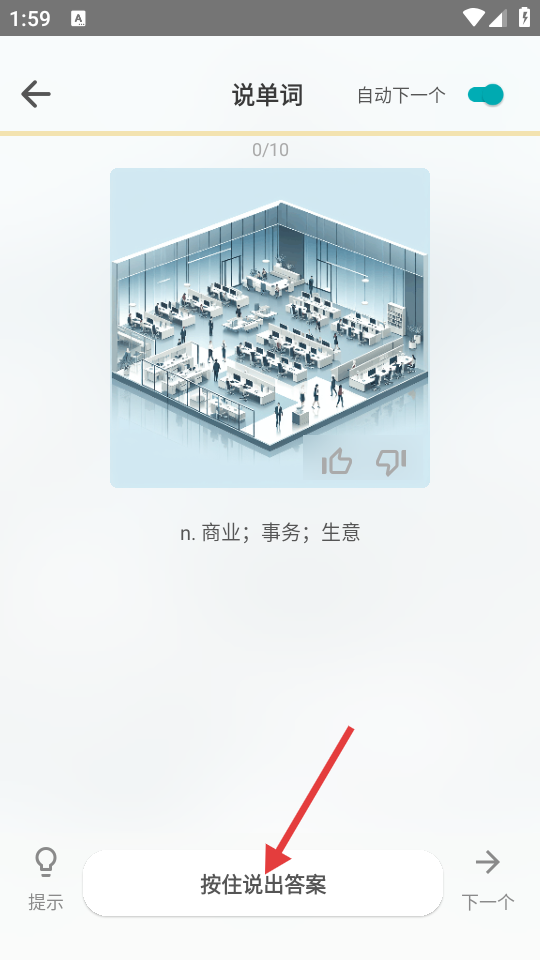 4、进入说单词页面,按住“说出答案”按钮,根据提示说出对应单词。