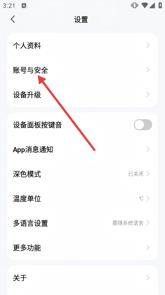3、在设置界面中,选择【账号与安全】选项,进入账号安全相关页面。