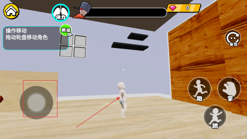2、游戏中,通过左侧轮盘操控角色移动,熟悉移动操作,探索房间场景。