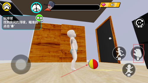 3、找到房间里的排球,点击【拿】按钮,拾取排球,为后续玩排球做准备。