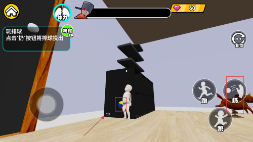4、拾取排球后,点击【扔】按钮,将排球投出,完成“玩排球”的任务要求。