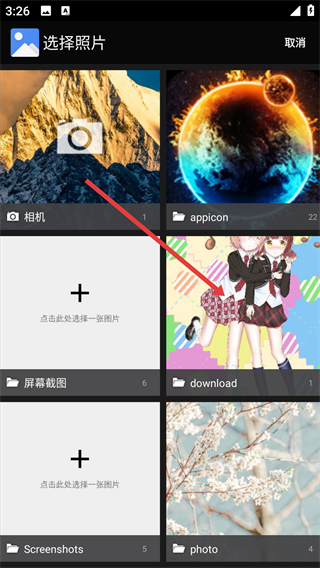 2、在【选择照片】界面,选择需要处理的图片,比如【download】文件夹中的动漫图片。