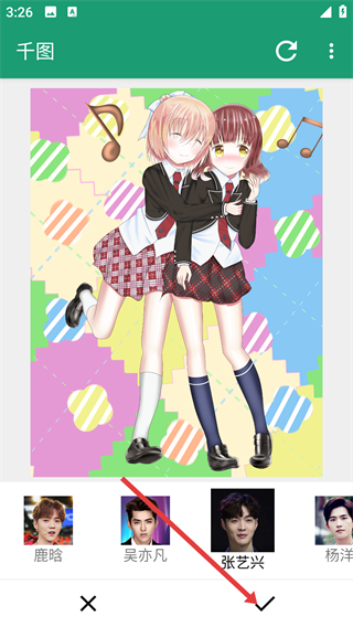 3、选好图片后,选择并点击喜欢的明星后,点击页面右下角的对勾图标,确认图片选择。