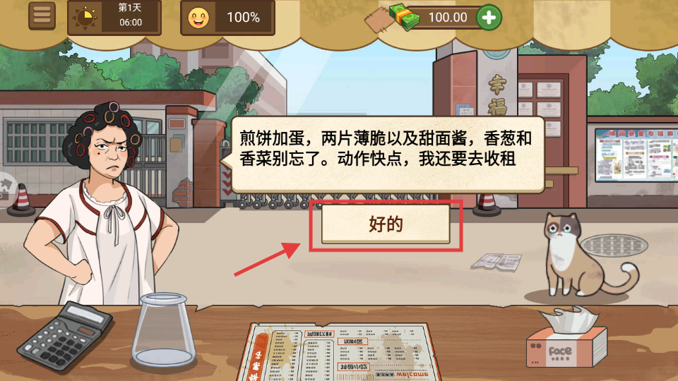1、接到顾客订单后,点击【好的】确认,按要求准备制作煎饼,留意食材细节。
