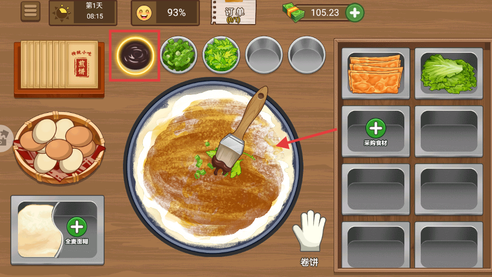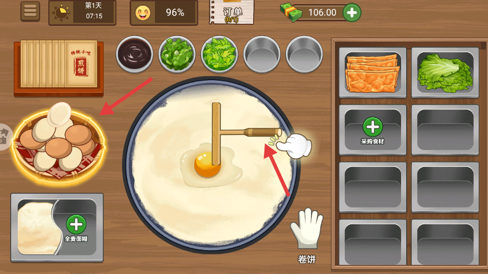 2、制作煎饼时,从【鸡蛋】篮取蛋打入,按提示用工具摊开,准备后续操作。