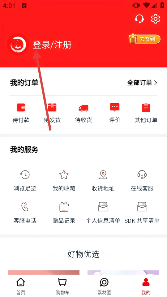2、在“我的”页面,点击【登录/注册】,进入登录注册界面。
