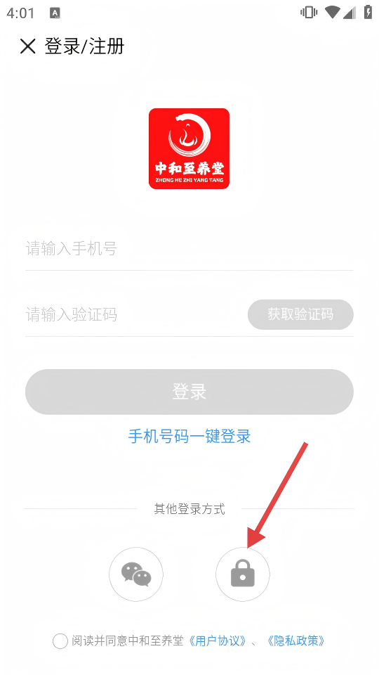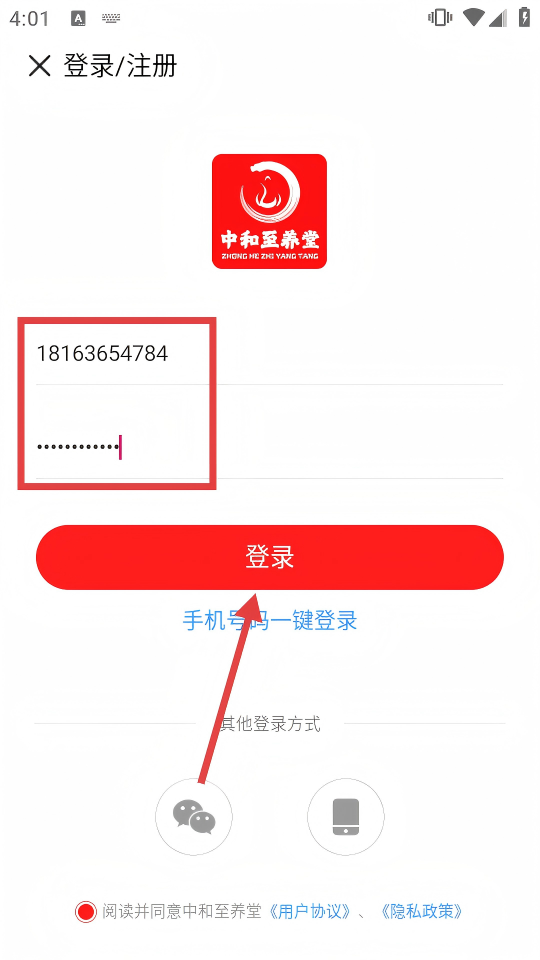 4、输入手机号、密码,勾选同意《用户协议》《隐私政策》后,点击【登录】,完成“中和至养堂”APP账号登录。