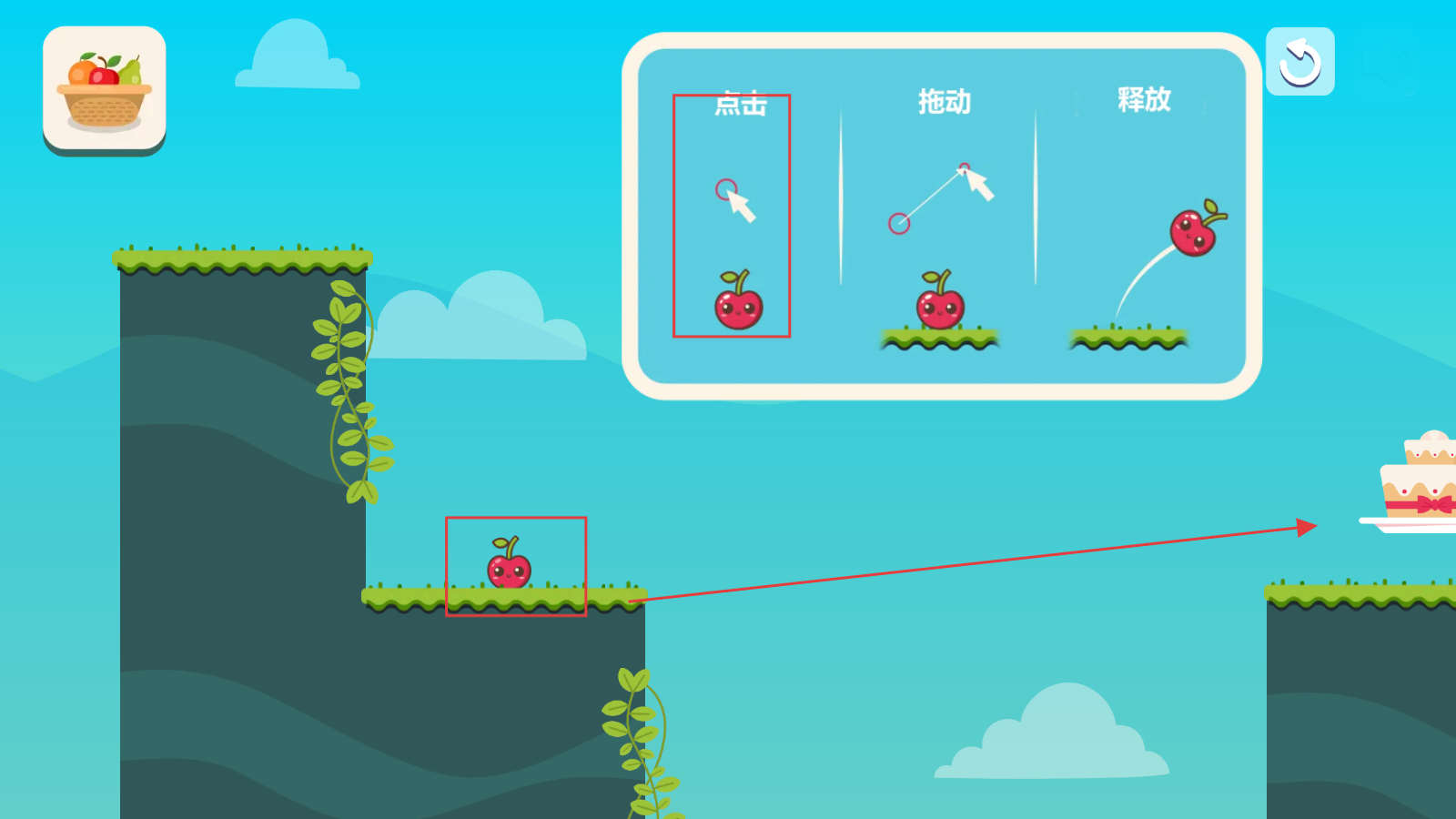 1、游戏开始,先点击樱桃,按照提示的“点击-拖动-释放”步骤,准备让樱桃移动。