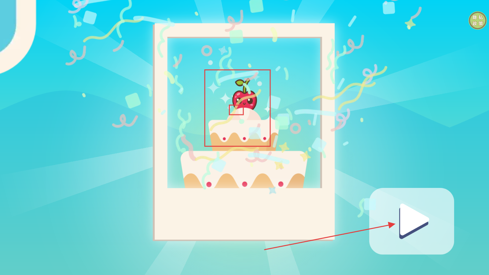 4、当樱桃成功到达蛋糕上,会出现庆祝画面,此时可点击播放按钮,继续后续游戏或查看结果。