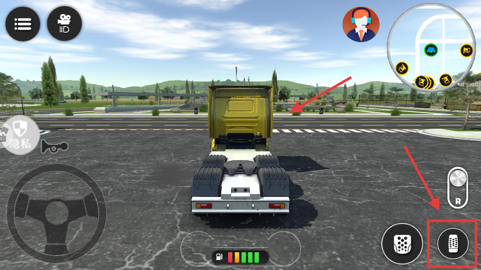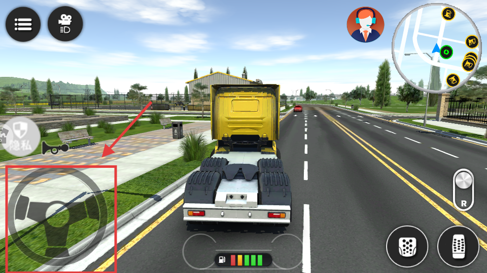 2、驾驶时点击右下角【油门】按钮控速,结合【R】键调方向,依地图规划路线。