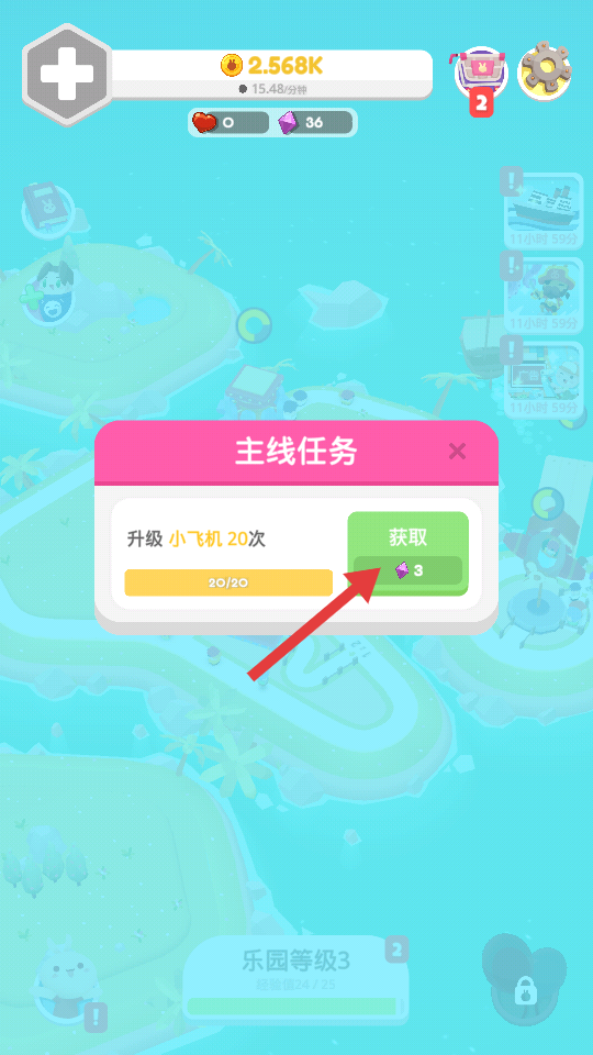 4、完成升级小飞机20次的主线任务后,点击【获取】,领取3宝石奖励。