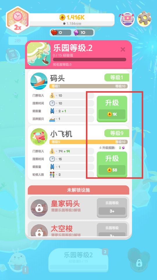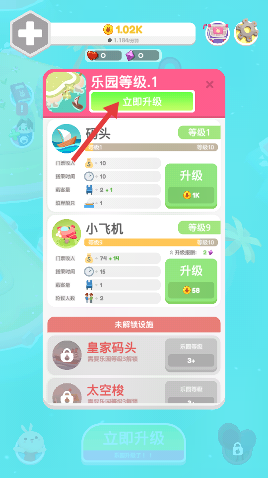 3、分别花费1K金币和58金币,升级码头与小飞机设施,增强乐园吸引力。