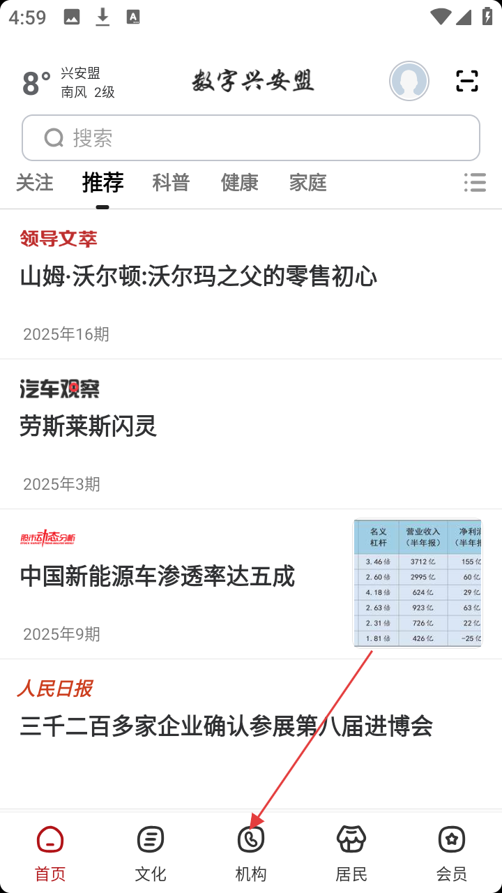 1、打开“数字兴安盟”APP,进入首页后,点击底部【机构】选项,进入机构页面。