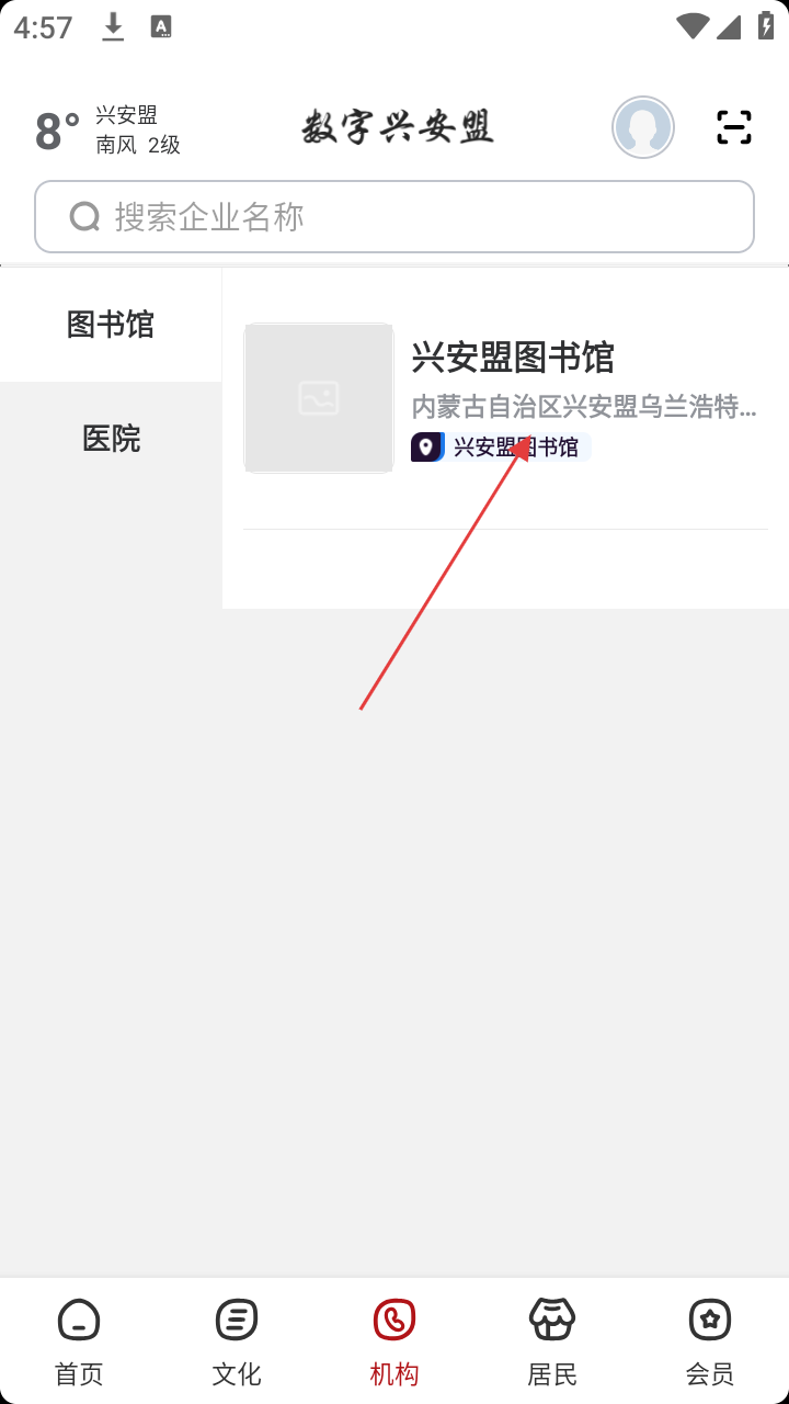 2、在机构页面,可看到【图书馆】等分类,点击【兴安盟图书馆】,进入其详情页面。