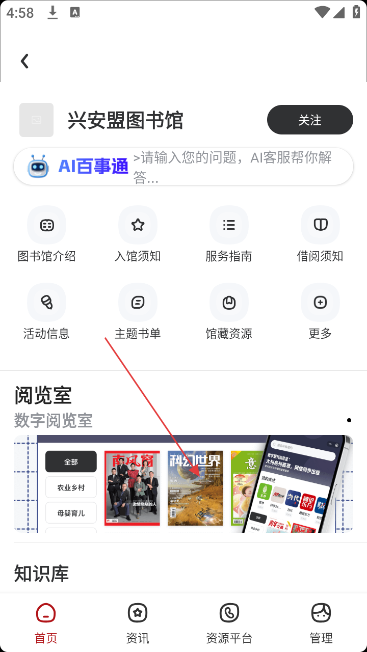 3、进入兴安盟图书馆详情页,能看到【图书馆介绍】【入馆须知】等功能选项,点击相关期刊区域,进入数字期刊阅览室。