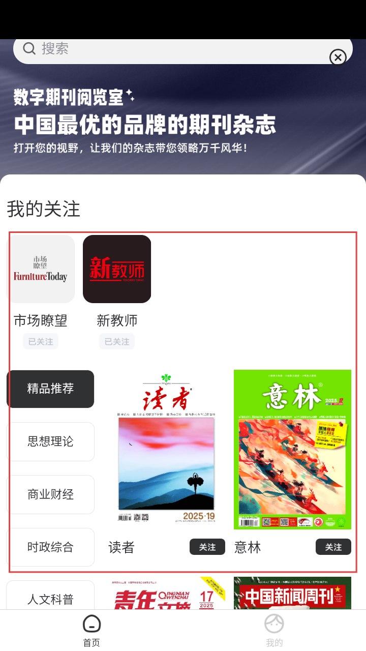 4、在数字期刊阅览室,可看到【我的关注】【精品推荐】等板块,能查看关注的期刊以及精品期刊推荐。