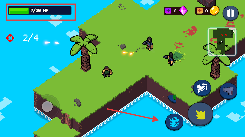 3、关注【7/20-HP】,血量低时点击【蓝色-技能】按钮,清敌保命并推进关卡。
