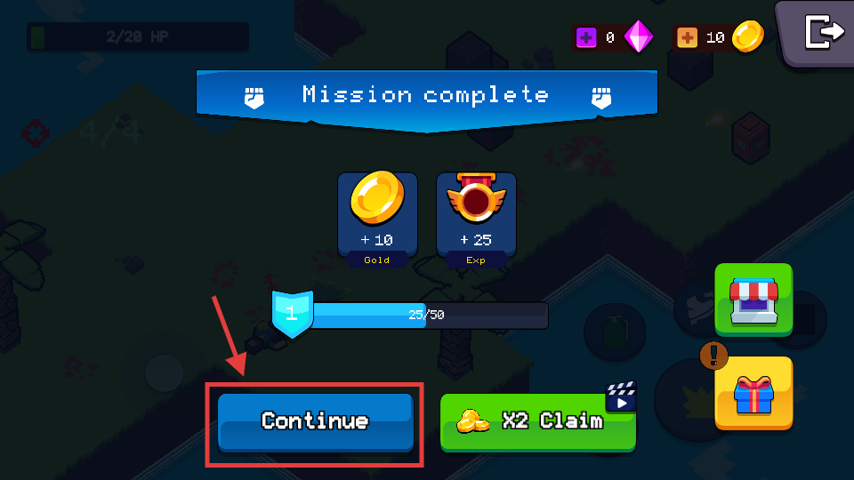 4、任务完成后点击【Continue】,继续下一关,积累【+10-Gold】【+25-Exp】升级。