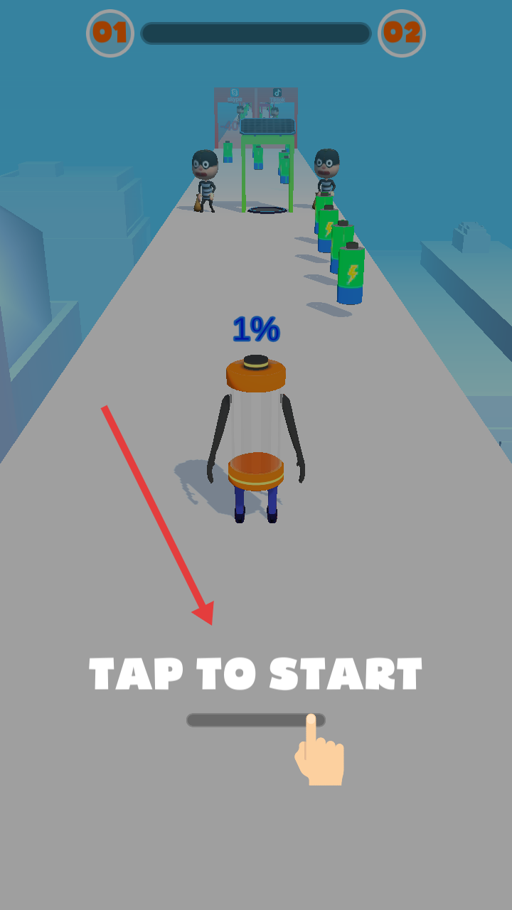 1、点击TAPTOSTART,操控电池造型角色在城市跑道开启冒险,初始电量1%,准备收集资源提升电量。
