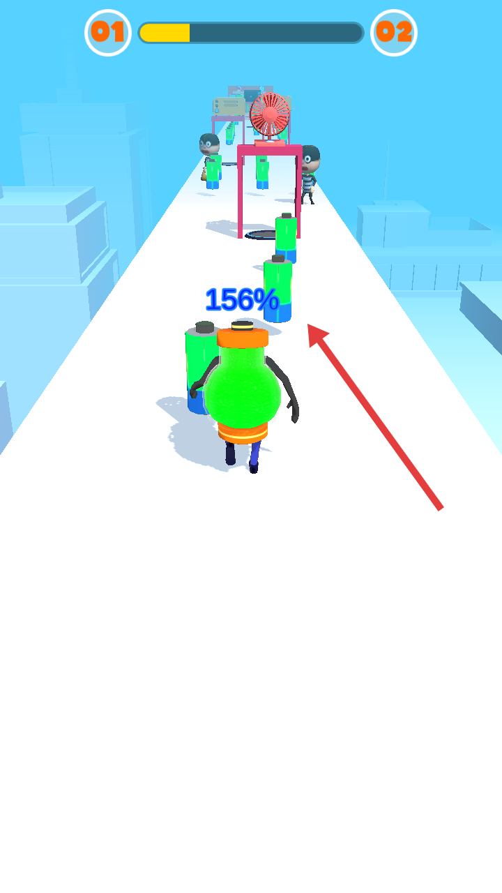 2、沿途收集绿色电池,提升电量百分比,如至156%,同时应对穿条纹服的敌人,稳步推进关卡。