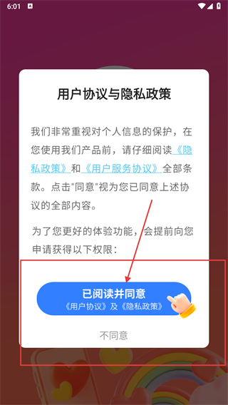 1、进入软件后,出现【用户协议与隐私政策】弹窗,点击同意按钮,即可进入软件主界面。