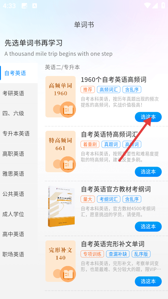 1、打开APP,进入单词书选择页面,选择想要学习的单词书类别,点击对应单词书的【选这本】。