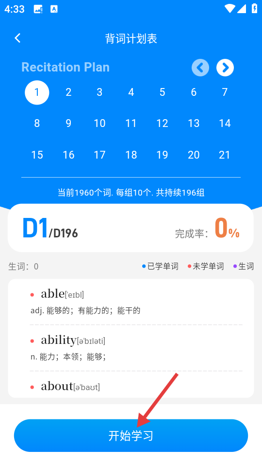 1、单词学习流程:选择所需词库开始背诵,查看详细释义和发音,通过例句理解单词的实际用法。
