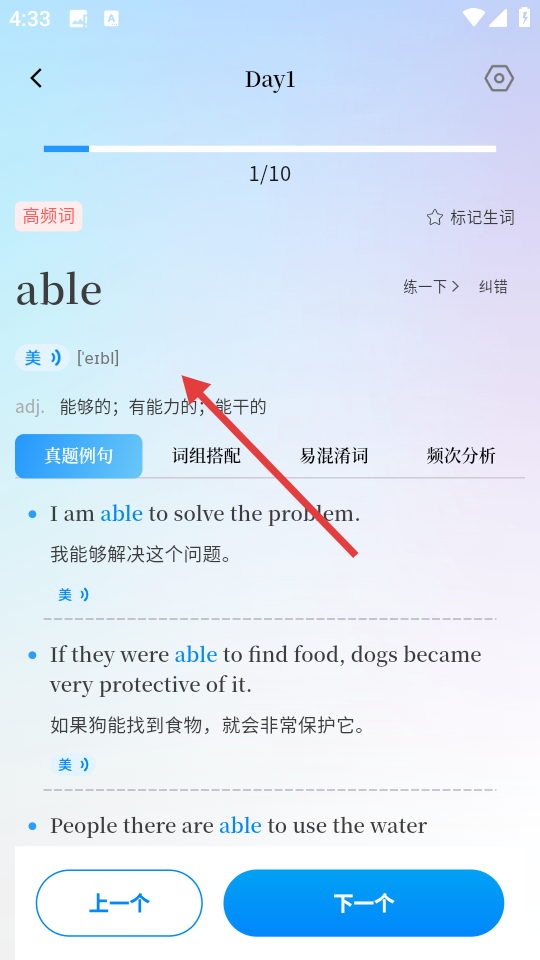 4、进入单词学习页面,可查看单词的音标、释义等内容,进行单词学习,也可点击【上一个】【下一个】切换单词。