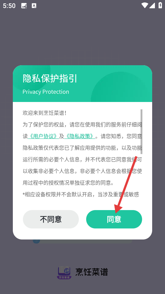 1、打开“烹饪菜谱”APP,在隐私保护指引弹窗中点击【同意】。