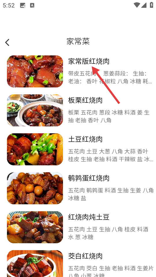 3、进入家常菜列表页面,选择想要查看的菜谱,如【家常版红烧肉】。