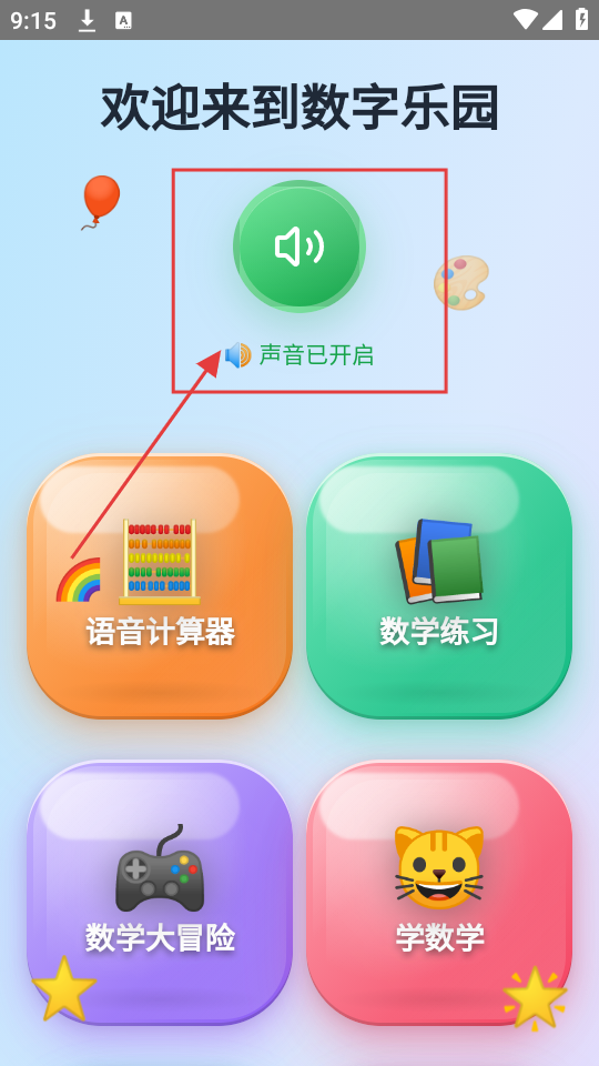 1、在“欢迎来到数字乐园”页面,若想关闭声音,点击绿色的声音按钮,就能将声音关闭啦。