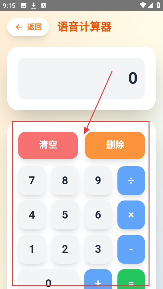 3、进入语音计算器页面,能看到数字和运算符号等按键,还有【清空】和【删除】按钮,方便操作计算内容哦。