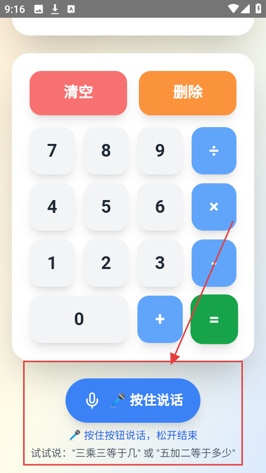 4、若想语音输入计算内容,按住【按住说话】按钮,说出算式,松开后就能进行计算啦。