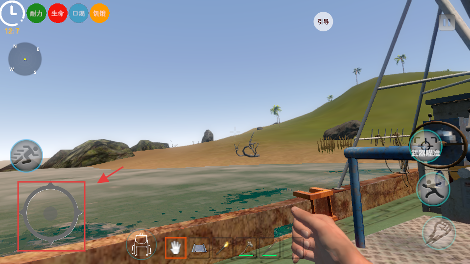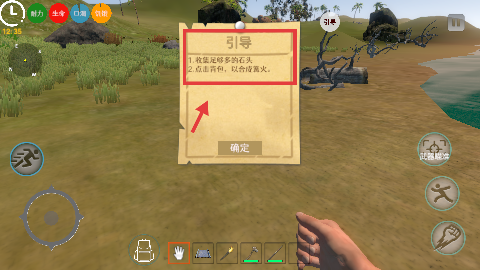 3、查看引导提示,按照“收集足够多的石头,点击背包以合成篝火”的步骤进行操作。