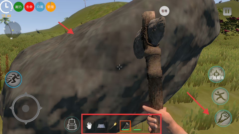 4、选择工具栏中的斧头,靠近石头,点击右侧攻击按钮,收集石头资源。