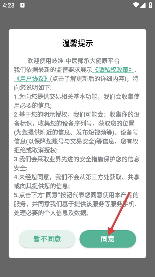 1、打开APP,在温馨提示弹窗中点击【同意】。