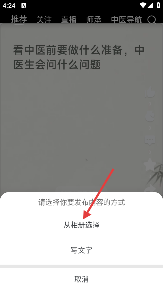 3、在弹出的发布内容方式选择框中,选择【从相册选择】或【写文字】(以从相册选择为例)。