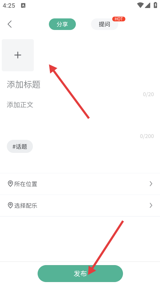 4、进入发布页面,点击“+”添加图片,然后添加标题、正文,设置话题等,完成后点击【发布】。