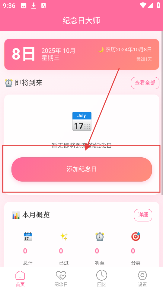 1、在“纪念日大师”首页,若想添加纪念日,点击【添加纪念日】按钮,就能进入添加纪念日的页面啦。