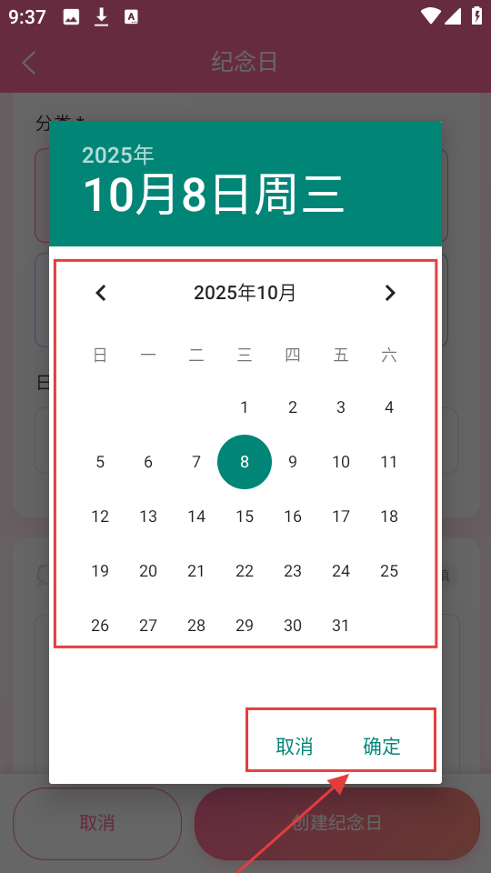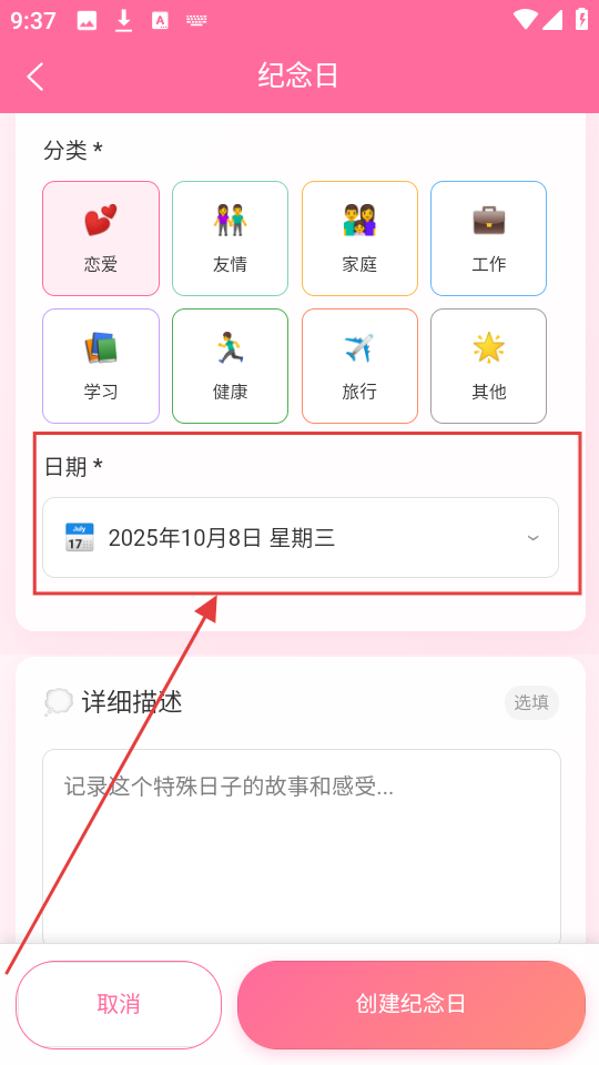 2、进入添加纪念日页面后,若想选择纪念日日期,点击【日期】选项,就能打开日期选择器啦。