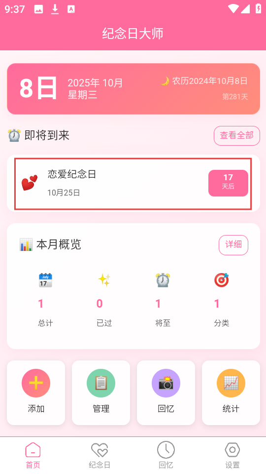 4、设置好纪念日相关信息后,回到首页,就能看到添加好的纪念日啦,方便查看和管理哟。